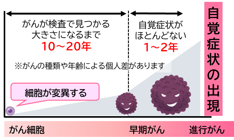 がんの種類にもよりますが、がん細胞は、最初のころはゆっくりと成長していき、自覚症状はありません。検査で見つけることができるサイズになっても自覚症状がないことが多いです。しかし、次第に周りの組織に侵入して悪い影響を与えるようになります。