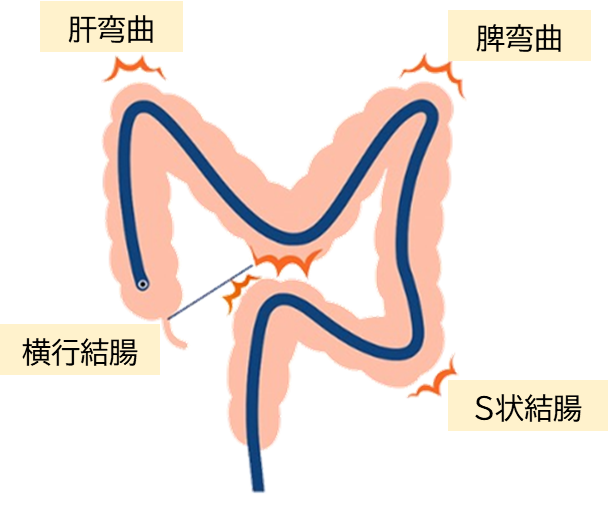 脾弯曲・肝弯曲では、腸の曲がりが急なため、カメラが引っかかり腸管が刺激され、痛みを感じやすいです。