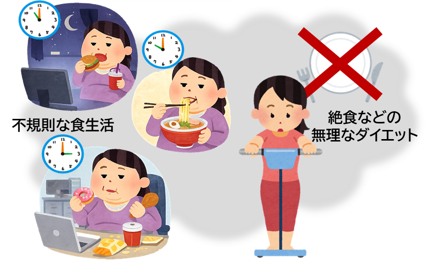 これらに当てはまり、さらに「不規則な食生活」や「過度なダイエット(絶食)」を繰り返している方は、特に注意が必要です。